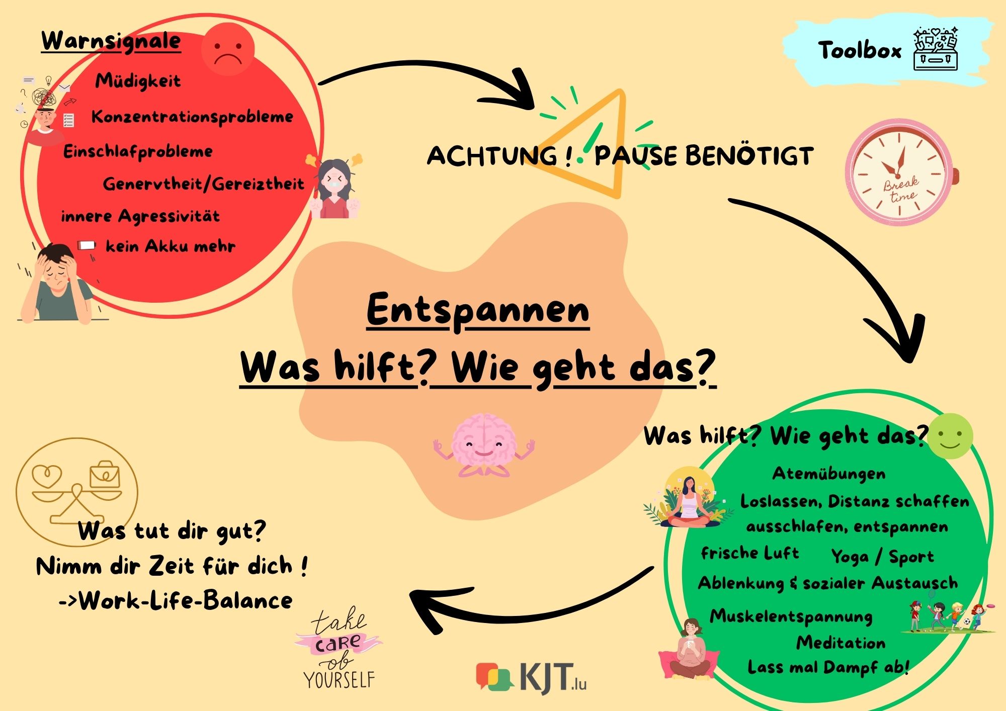 Entspannungstechniken sind hilfreich in Zeiten der Anspannung, Stress und Druck. Ausatmen, loslassen ist hier gefragt. Fantasiereisen, progressive Muskelentspannung nach Jacobson, Autogenes Training, Sophrologie, Meditation, Klopftechniken (auch „Tapping“ genannt, wie z.B. EFT-PEP) sind hilfreich. Online findest du angeleitete Übungen und Erklärungen.