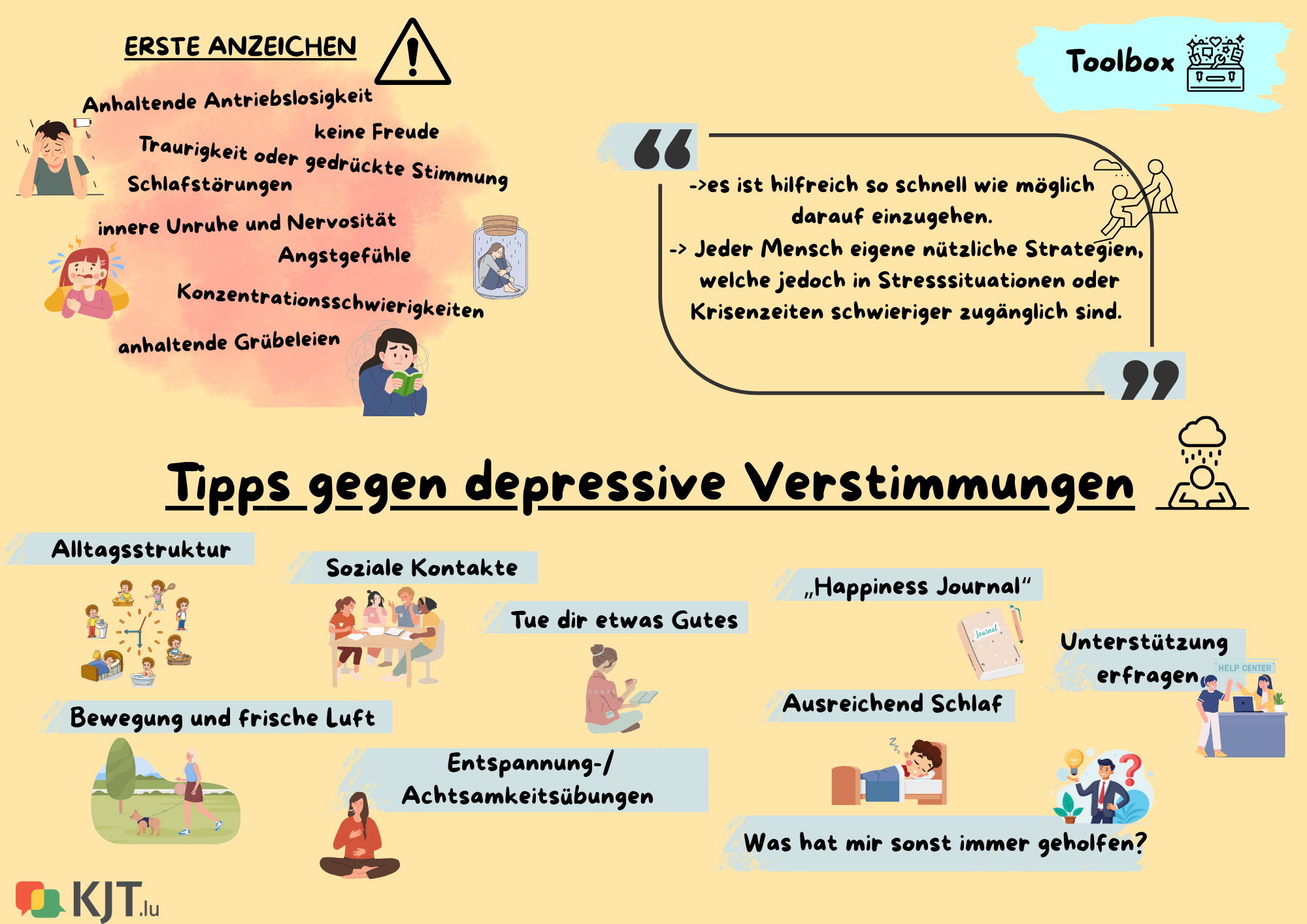 Anhaltende Antriebslosigkeit, Traurigkeit oder gedrückte Stimmung, keine Freude an Dingen die dir sonst Freude bereitet haben, Schlafstörungen, innere Unruhe und Nervosität, anhaltende Grübeleien, Gedanken die dich nicht mehr loslassen, Konzentrationsschwierigkeiten und Angstgefühlen; kennst du das auch?